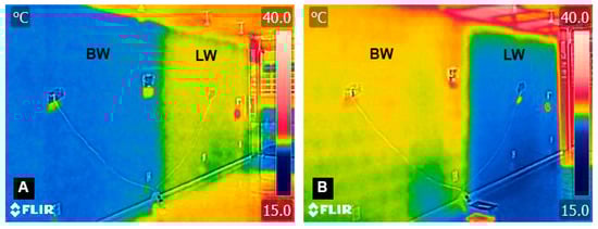 Thermal photos of the internal surface of plots. Legend: (A) at 8:45 a.m.; (B) at 12:45 p.m.; BW: control plot; LW: protected plot.