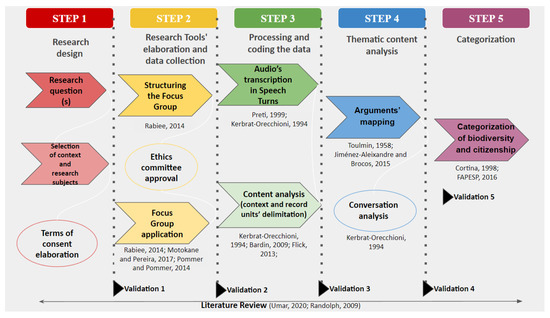 The first step was to design the research, selecting the context and subjects of our research (Figure 1). We collected the data inside the classroom with a group of nine students from the second year of high school (between 15 and 17 years old, randomly selected). We proposed the number of students according to [52], who consider the optimum number of participants to be between six and ten, aiming to maintain a variety of perspectives at the same time that the focus of the discussion remains. The teacher and coordinator, of the school’s only first- and second-year classrooms, randomly selected the group.