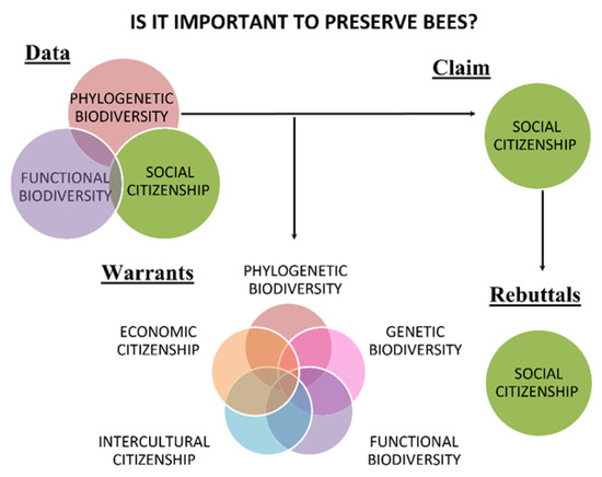 Argumentation occupies a relevant position among the skills required for science education in the context mentioned above [23]. The importance of argumentation as a linguistic resource is well known, given its wide insertion in the social field and the subjects’ discourse, and it is in the discourse that cultural meanings are elaborated and the idea of belonging and identity is projected [24]. Therefore, skills such as recognizing and listing data, warrants, and claims in the face of existing problems are part of the subject’s construction and its cultural discourse, helping to formulate a critical understanding of reality and being and acting in it from a collective and critical perspective. Therefore, to argue is to make explicit values, cosmovisions, and identities in the construction of the feeling of belonging, a key aspect of citizenship [7,16,25].