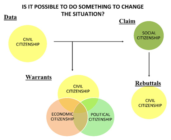 In this context, the argumentative process permeates the association of different actors and social spheres in dialogue. Such considerations start from different dimensions of citizenship, associating the environmental problem with the influence of other fields of culture, such as the media, government, politics, and industry, among others. In addition, Figure 5 explains the dimensions of citizenship used in the argument.