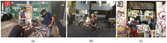 Fieldwork procedure. (a) Assembly of measuring sensors on the bicycle; (b) completion of the cyclist route; and (c) sensor removal and finalization of the field activity.