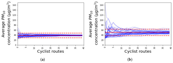 In this study, the methodology developed in [16] was followed to estimate the minimum number of cyclist routes per monitoring route required to obtain representative average concentrations of PM, PM and NO, at the route level. This methodology comprises the development of a numerical experiment using the pollutant concentrations registered during the cyclist routes, defining the following parameters: spatial scale of interest (in this case, the entire monitoring route), averaging method (mean and median), and records correction method (not implemented in this case). The numerical experiment, which must be carried out several times (in this case, 40 analogous experiments were done), implies calculating the average (or median) pollutant concentration, considering all the cyclist routes performed. This average represents the actual real target value. An acceptable level of accuracy is then defined (in this case, 25%). Next, the average (or median) of a random set of cyclist routes is calculated, increasing from considering a single cyclist route (with repetition) until the incremental result is consistently within the accepted accuracy range defined. At this point, the minimum number of cyclist routes to be performed to obtain representative results is determined.