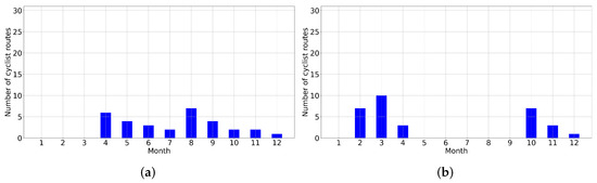 Monthly distribution of cyclist routes for each monitoring route. (a) Route N°1; and (b) Route N°2.