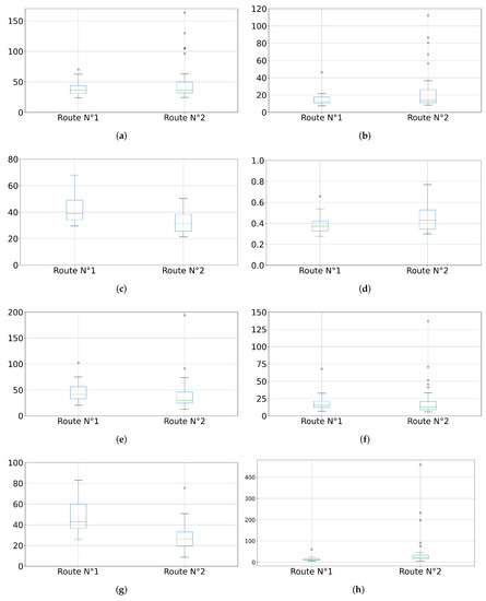First, Table 3 shows the average and standard deviation values for different parameters measured in the two monitoring routes. In addition, the Mann–Whitney statistical hypothesis test was performed (this statistical hypothesis test is non-parametric, that is, its application does not presuppose that data follow a specific probability distribution), with a confidence level equal to 0.95, considering the records of each parameter measured in each monitoring route. In this case, the null hypothesis () of the test is that both samples analyzed (the records of a parameter measured in two different monitoring routes) come from the same population or distribution. For the application of this test, the analyzed samples must be independent. In this case, samples are assumed to be independent since cyclist routes carried out on two different monitoring routes are being compared (in addition, a single cyclist route was conducted per sampling day). The results of applying this statistical hypothesis test are also shown in Table 3.