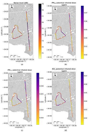 In addition, spatial variations are observed for the distributions of atmospheric pollutant concentrations, potential inhaled doses, and noise levels within the monitoring routes. In this sense, the average maps at the street between intersections level, pooling every cyclist route performed in each monitoring route, are presented in Figure 9 and Figure 10.