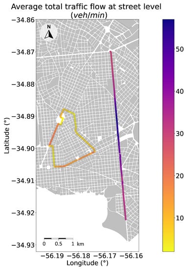 Then, the average data matrices per street between intersections obtained for each cyclist route were joined with the urban environment parameters, forming a single joint matrix of average data per street between corners (environmental exposure, meteorological variables, and urban environment parameters). Considering the monitoring route analyzed, simultaneous traffic flow records were requested from the Municipality of Montevideo (Figure 3). Next, these traffic flow values (together with the manual traffic counts obtained for Route N°1) were averaged for the entire cyclist route duration in units of veh/min and were assigned to the streets where they were recorded. In the same way, the motorized traffic flow composition obtained through the field campaign was also set to the streets where the measurements were done.
