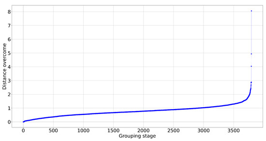 A practical problem that arises from the above is the definition of a reasonable number of groups where the grouping process ends. The principle that guides this decision is to find a grouping level that maximizes the similarity between the elements of each group while minimizing it between different sets. A traditional subjective approach to solving this problem lies in the inspection of a graph that shows the distance between the groups overcome in each stage of grouping. Ideally, the clustering process should stop immediately before this distance shows a sharp jump [31].