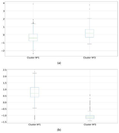 Next, and for each data set, the average values of the standardized anomalies of the analyzed parameters were calculated for the two clusters with the largest number of records. Then, and also for each data set, the Mann–Whitney non-parametric hypothesis test was performed between the values of the parameters present in the two main clusters. In this sense, it was stated that a cluster presents a higher value than another for a specific parameter if two conditions were satisfied: the average value of said parameter was higher in one of the two analyzed clusters; and the difference between the records belonging to these clusters was statistically significant (Mann–Whitney test).
