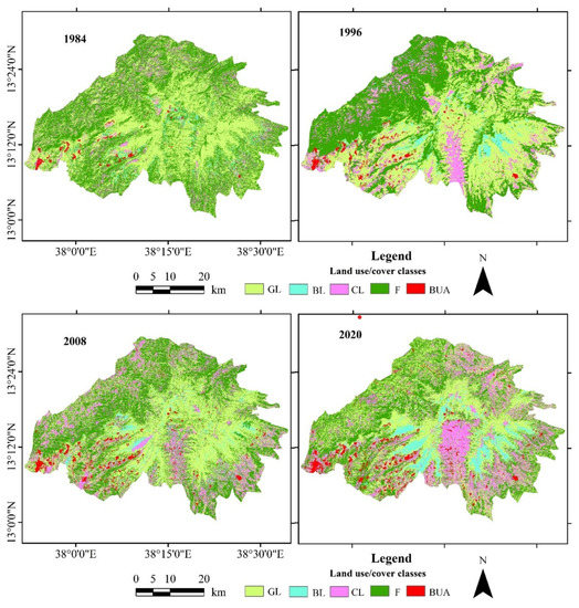 A total of five LULC classes and four maps were identified and produced in the study landscape for the reference years 1984, 1996, 2008, and 2020 (