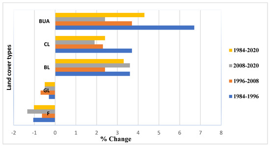 The trend analysis for three consecutive periods (1984–1996, 1996–2008, and 2008–2020) showed spatiotemporal changes in the LC types. A comparison of the three study periods revealed that cultivated land increased at a rate of 3.7% (1984–1996), 2.3% (1996–2008), and 1.9% (2008–2020), at a rate of 971 ha year