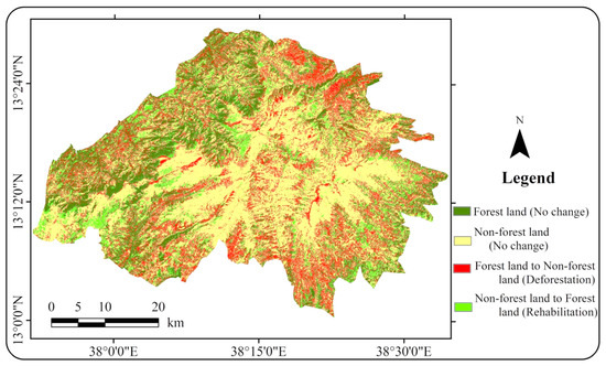 Figure 5, deforestation, rehabilitation, and no change describes the transition from forest to non-forest, non-forest to forest, and non-forest to non-forest/forest to forest, respectively.
