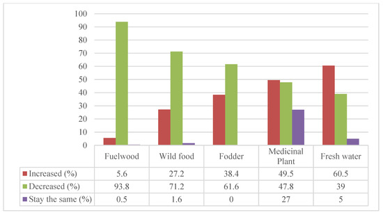 Declining forest cover has far-reaching impacts on the availability of forest products and services in the study area. The results revealed that 92% of the surveyed households perceived a change in forest ecosystem services availability, while only 8% did not perceive changes (