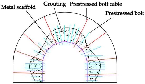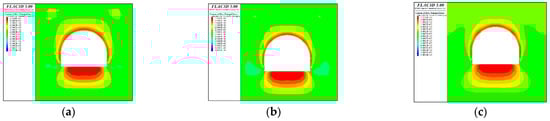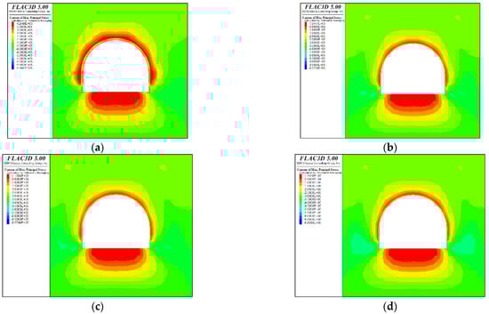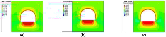 - The bolt spacing and bolt length significantly affect the thickness of the compression arch, and the bolt spacing, bolt length, and pre-tightening force of bolts significantly affect the strength of the compression arch. The bolt pre-tightening force F = 70 kN, the length L = 2400 mm, and the additional compressive stress begin to be effectively superimposed when the bolt spacing is reduced to a × b = 600 mm × 600 mm. When reducing the bolt spacing between the bolts to a × b = 500 mm × 500 mm, 400 mm × 400 mm, the thickness of the compression arch is changed from 0 mm to 266.67 mm, 533.33 mm, and the strength of the compression arch is increased from 0 MPa to −1.489 MPa, −1.533 MPa. The pre-tightening force of the bolt is changed to F = 50 kN and 90 kN, the thickness of the compression arch is unchanged, and the strength is changed from−1.533 MPa to−1.482 MPa and−1.589 MPa; when the length of the bolt is changed to L = 2000 mm and 1500 mm, the thickness of the compression arch is changed to 400 mm and 266.67 mm, and the strength of the compression arch is changed from−1.533 MPa to−1.494 MPa and−1.48 MPa.