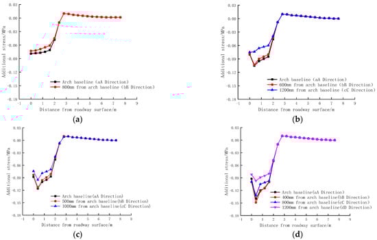 - The bolt pre-tightening force F = 50 kN, F = 70 kN, and F = 90 kN; the additional compressive stress along the surface of the straight wall of the roadway increases first and then decreases with the increase of the arch baseline distance.