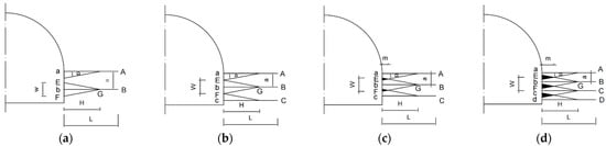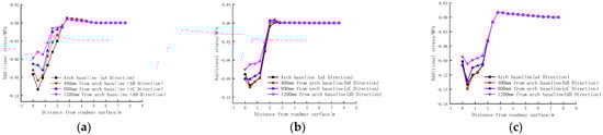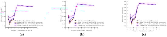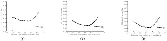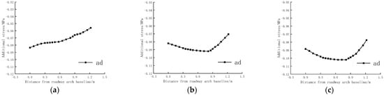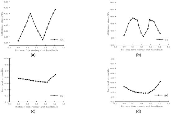 - The bolt length L = 1500 mm; the additional compressive stress along the straight wall surface of the roadway decreases with the increase of the arch baseline distance. The bolt length L = 2000 mm and L = 2400 mm; the additional compressive stress on the surface of the straight wall along the roadway increases first and then decreases with the increase of the arch baseline distance.