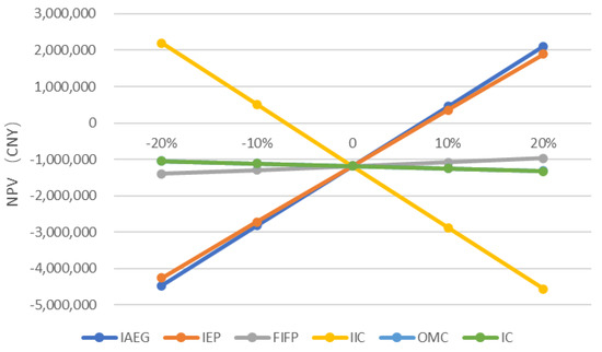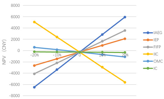 To explore the effect of key factors, such as the initial annual electricity generation (IAEG), initial electricity price (IEP), feed-in tariff price (FIFP), initial investment costs (IIC), operating and maintenance costs (OMC), and insurance costs (IC), a sensitivity analysis is conducted. After carrying out calculations, the NPV of the industrial and commercial distributed-PV project in this study in relation to the changes in the key factors such as IAEG and IIC, is illustrated in Figure 3. We can see that the three most important influential factors are IIC, IAEG and IEP. Among them, IIC is the single most influential factor in the NPV. When the IIC is reduced by 10%, the NPV will increase by approximately 1430%, with an IRR of 8.4% and with a DPI of 1.04. Therefore, the measure that can decrease the IIC of the residential distributed-PV project should be adopted as a priority option.