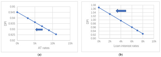 For a benchmark industrial and commercial distributed-PV project, the impact of a single policy such as preferential AT and green finance has been investigated. For example, the DPI for the deployment of industrial and commercial distributed-PV projects in China is calculated for the AT rates of 11%, 9%, 7%, 5%, 3%, and 0, and for loan interest rates of 8%, 7%, 6%, 4%, 2%, and 0. The results are illustrated in Figure 5a,b. A preferential-AT policy measure will be helpful to increase the economic feasibility of the benchmark industrial and commercial project, as the effect is quite small. However, a green-finance policy highlighting a lower loan interest rate can render industrial and commercial distributed PV economically viable in the target area.