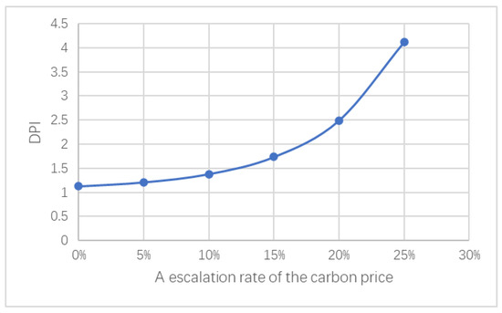For the preferential-VAT policy and the preferential-corporate-IT policy, the DPI for the deployment of industrial and commercial distributed-PV projects in China is calculated for VAT rates of 17%, 8.5%, 7%, 5%, 3%, and 0 and for corporate IT rates of 25%, 20%, 15%, 10%, 5%, and 0. The results show that both of them can contribute to enhancing the DPI and to making it become a profitable industrial and commercial distributed PV. If the carbon-trading policy is applied to industrial and commercial distributed-PV projects in China, profitability will be improved significantly, as shown in Figure 6. In addition, a rising initial-electricity-price policy and a rising initial-FIF-price policy can also play an important part in enhancing the economic viability of industrial and commercial distributed-PV projects.