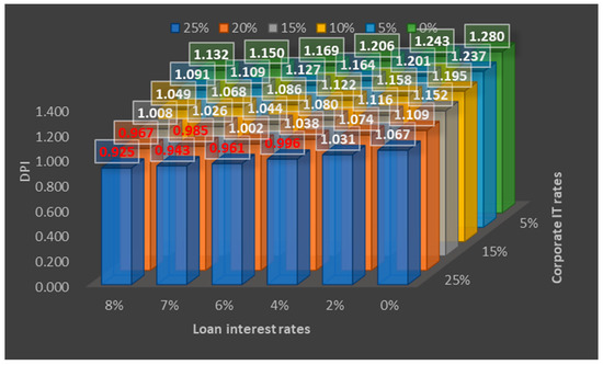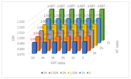 For a benchmark residential distributed-PV project, the impact of a single policy such as preferential VAT and corporate IT has been determined. For instance, the DPI for the deployment of residential distributed-PV projects is calculated for the VAT rates of 3%, 2.5%, 2%, 1.5%, 1%, and 0 and for corporate-IT rates of 1.5%, 1.25%, 1%, 0.75%, 0.5%, and 0. The results are shown in Figure 7a,b. As a preferential-corporate-VAT policy is introduced, the DPI becomes higher, indicating improved economic value for residential distributed-PV projects. A smaller VAT rate thus leads to a bigger DPI. Therefore, preferential-VAT policies will play an important part in enhancing profitability. Although a preferential-corporate-IT policy measure can also contribute to making residential distributed-PV profitable, the effect is lower than the preferential-VAT policy.