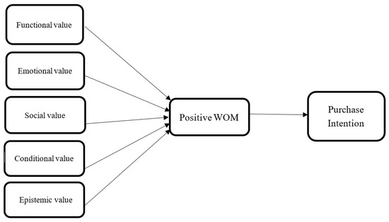 Despite positive word-of-mouth’s popularity, existing researchers have mainly skewed their investigations on positive word-of-mouth so as to treat it as an outcome or endogenous variable [13,18,22,32,52,56,57], although a string of researchers has tested positive word-of-mouth as the exogenous variable for its abilities to trigger behavior outcomes [19,32,57,58]. Therefore, studies on positive word-of-mouth as the mediator are scarce, this despite the fact that the mediator’s primary function is to accelerate or exert influence [59], where positive word-of-mouth perfectly fits. It is also noted that the existing literature on positive word-of-mouth as the mediator is either investigated in a non-green context [60] or eludes the consumption value perspective despite the authors’ investigation of green settings [31]. As such, this study is poised to investigate positive word-of-mouth’s role towards green purchase intention, followed by investigating positive word-of-mouth from a mediating perspective, i.e., between the value factors and green purchase intention. The proclivity of positive word-of-mouth to catalyze green produce will likewise also be tested as a determinant of green purchase intention directly.