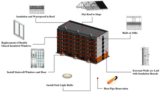 According to the Design Standard for Energy Efficiency of Residential Buildings [40], the energy saving rate should stay at 75%, which means renovated buildings have to reduce 75% of their energy use. Hence, these energy-saving measures were designed to attain an energy saving level and are shown in Figure 3. The parameters of the renovated building envelope are shown in Table 3.