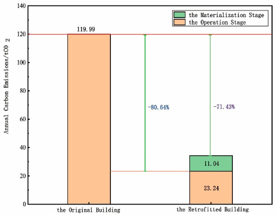 As shown in Figure 4, the carbon emissions from the original building during the operation stage is 119.99 t CO2/a; following the transformation, it was reduced to 23.24 t CO2/a and the rate of reduction was up to 80.64%. However, the renovation process generated carbon emissions of 198.66 t CO2 in total, which was converted to 11.04 t CO2/a; considering this carbon emissions value, the carbon reduction rate still remains at 71.43%.