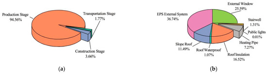 Carbon emissions pie chart. (a) Proportion of carbon emissions during the materialization stage. (b) Proportion of carbon emissions from renovation measures during the materialization stages.