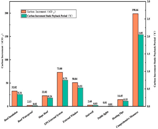 - In this case, renovation measures would positively influence carbon emission reductions during the use stage. A total of 96.75 t of CO2 would be reduced every year, and the rate of carbon saving would be about 80%. Nevertheless, renovation measures must rebuild the existing building with new materials, increasing the life cycle of carbon emissions. Significantly, the renovation involved in the building envelope (EPS external insulation, roof insulation, sloped roof, and external windows) would comprise a 91.41% carbon increase, improve common areas (stairwell, lighting), and replace heat pipes occupying 1.32% and 7.27%, respectively. In sum, the carbon increments per unit area of the combination of retrofitting measures are 110.32 kg CO2/m2. The static payback period of carbon increments is 2.05 years.