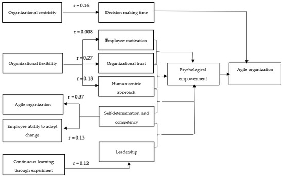According to Civelek [43], the structural equation model is a statistical method for representing the relationship between the variables in a study visually. The variables considered in this study represent the role of psychological empowerment for creating an agile organization. The relationship between the factors of agile organization and the components of psychological empowerment was established in this case. The unit for representing the relationship is the Pearson correlation, which is represented as r in Figure 1. The reason behind denoting the Pearson Correlation as r is the statistical analysis of the samples. The study has found that employee motivation (r = 0.008) has a positive relationship with organizational flexibility. Organization trust (r = 0.27) and the human-centric approach of an organization are showing a strong positive relationship with organizational flexibility.