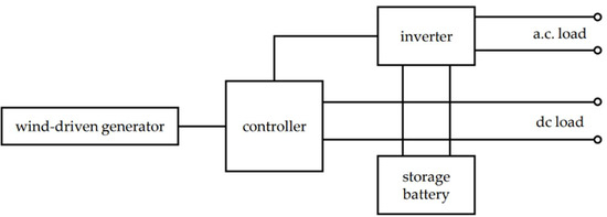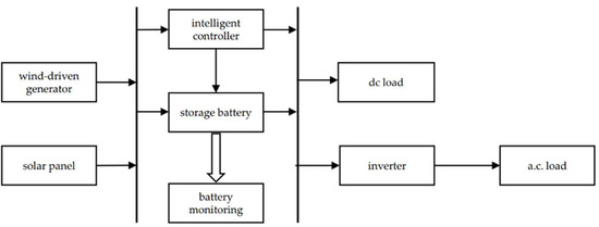 As seen in Figure 3, the wind–solar complementary power supply system comprises a wind turbine, a solar cell module (square array), a wind–solar complementary controller, an inverter, a battery pack, and other components.