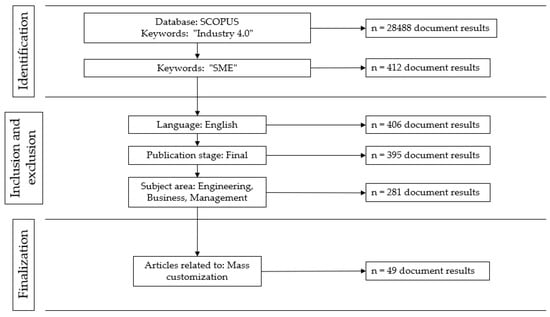 As can be seen in Figure 1, this literature review concerns a total of 49 publications. Using the SCOPUS database and “Industry 4.0” as the keyword, a total of 28,488 publications were returned. By adding “SME” as a keyword, a total of 412 publications were returned. By adding “English” as an inclusion and exclusion criterion, “Final” as the publication stage, and “Engineering, Business, Management” as the activity area, a total of 281 publications were filtered. Finally, by finalizing the search by sorting the articles related to mass customization, a total of 49 publications were returned and could be analyzed. This literature review was then expanded by analyzing each publication, which in turn, referenced other publications.