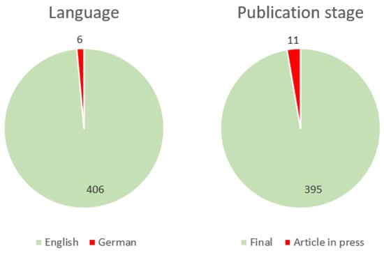 Figure 2 and Figure 3 show profiles of the results using the exclusion and inclusion criteria of language, stage of publication, and field of activity. The items included in the research are represented in green.
