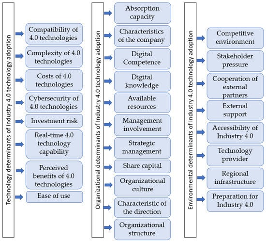 Technological, organizational, and environmental determinants of Industry 4.0 technologies adapted from Ghobakhloo et al. [22].