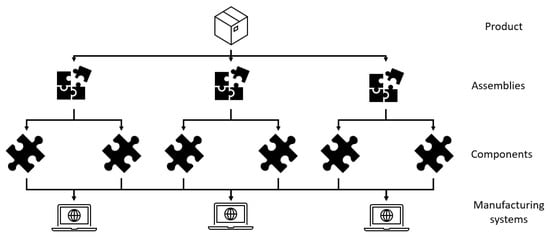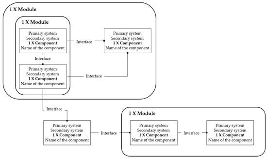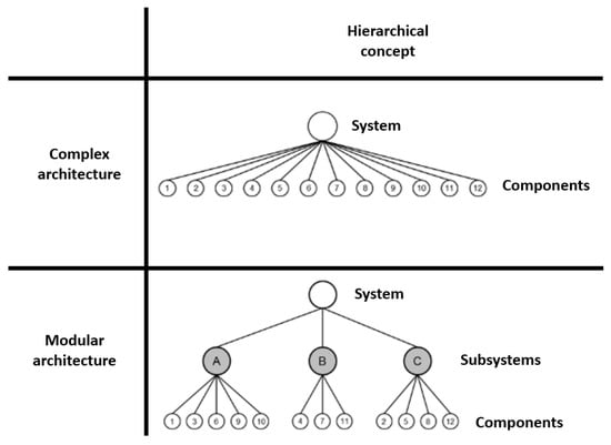 As an important element in the migration to mass customization, product decomposition is a much-researched topic in the literature. The concept of product families has been explored, as it relates to obtaining an agile and easily reconfigurable product that meets customer requirements. In their research, based on an approach analyzing the sales data of configurable products, Kusiak, Smith, and Song [71] emphasized the importance of product families in meeting diverse needs. By working with product families in a just-in-time environment, it is possible to provide subassemblies that meet the customer’s product specifications within a targeted timeframe. However, companies often grapple with how to reduce the complexity of a product without impacting the range of options available to customers [75]. Koppenhagen and Held [75] proposed products with a modular architecture to meet this demand. Modular products make it possible to standardize the creation process by limiting part variability without reducing customer choice. Figure 10 illustrates this principle through a modular architecture with a hierarchical concept. Indeed, the decomposition of a product into modular systems and subsystems makes it possible to respect the principles of modularization.