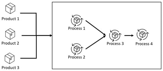 Different production processes can therefore be set up in a manufacturing system to produce complex products using distributed manufacturing [73]. Figure 9 illustrates this concept, which translates into distributed manufacturing. As can be seen, different products can be traded through production processes using distributed manufacturing.