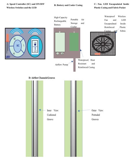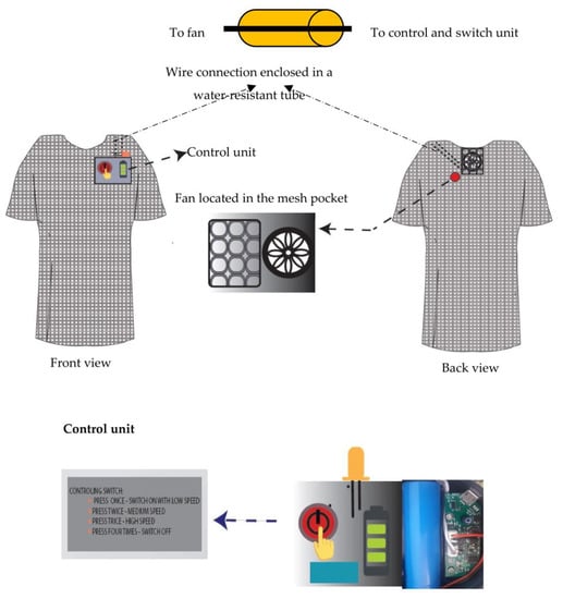 We manually modified an off-the-shelf sportswear T-shirt made from a perforated material (to support sweat evaporation and wind cooling) to design the prototype, as the T-shirt has moisture transport properties to provide improved cooling comfort [84]. We attached a 5 V axial cooling fan to the upper back area of the T-shirt. The fan (77 mm × 56 mm [85]) is powered by a high capacity, rechargeable 1200 mAh, 5 V battery connected to a push-button switch, which also acts as the speed controller. A LED is located near the switch. The speed controller push button enables three fan speed levels: low, mid, and high. The LED emits a blue indication when the fan is operating. The battery, circuit board, and switch controller were encapsulated inside a waterproof casing. A pocket was designed just below the shoulder to hold the switch controller unit. This pocket has Velcro tape to retain the cooling controller unit (switch, battery, and circuit board encapsulated in plastic casing). The fan was placed in a pocket construction attached to the upper back area of the T-shirt, which was made from a mesh material to allow the air circulation required for the fan operation. The wire connection attached to the switch/speed controller was placed inside a tube made from water-resistant fabric. Circuit wires were located in a waterproof fabric tube to improve their durability and safety. The entire cooling unit, including this tube, is detachable and waterproof to allow home laundering (Refer to Figure 1 and Figure 2; and Table 2). The total weight of the prototype is 271 g, and it costs 20 Australian dollars (AUD 20). Eight prototype samples were made considering the rough body measurements of the field study participants.