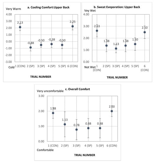 (a) Average cooling comfort: upper back; (b) average wetness sensation: upper back; (c) average overall comfort.