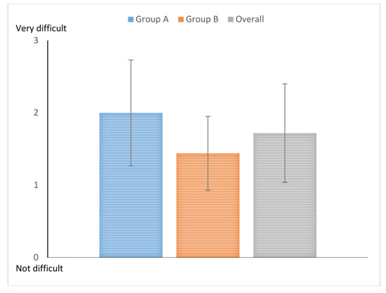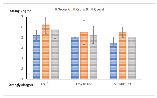 However, there was no significant difference in “easy to use” perception between group A and B participants, t (15) = 1.73, p = 0.1, despite group B participants (M = 5.5, SD = 1.55) demonstrating better “easy to use” ratings than group A participants (M = 5, SD = 0).
