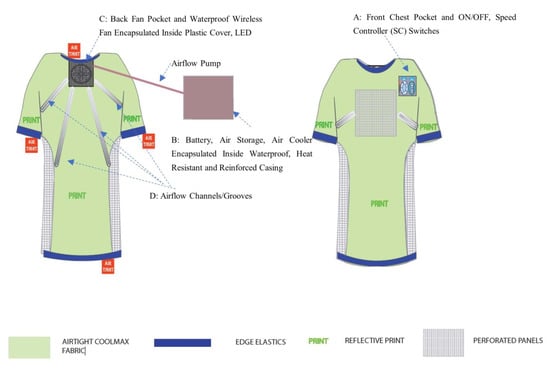 An air-cooling fan was selected as the cooling technology for our sportswear prototype after considering user preferences and the low-cost and light weight nature of the technology compared to other smart cooling technologies [83]. Air-cooling concepts are also known as ambient air systems that allow air to circulate through a garment. Moreover, the hybrid design consisting of smart cooling and perforated materials of the proposed sportswear design provides cooling comfort to a wider body area of an athlete with minimum technology intervention. Hence, a cost advantage can be obtained. Moreover, the circuit components of the prototype were made water repellent, heat resistant, and reinforced to improve durability, thus improving sportswear’s lifetime and ultimately reducing user cost expenditure. Considering the design suggestions (See Table 1), we iteratively developed the cooling sportswear prototype as explained in the below section.