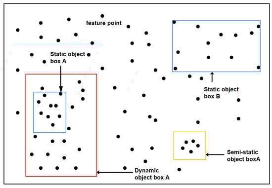 As illustrated in Figure 2, because there are frequently a large number of pixels in the dynamic detection box of the object detection algorithm that do not belong to the dynamic object, deleting all feature points in the dynamic object box will inevitably result in the loss of a large number of high-quality static feature points, resulting in inaccurate pose estimation and even tracking failure. As a result, after extracting the ORB feature points of the current frame in the tracking stage, we used the data information (object class and detection frame coordinates) of different objects processed by the object detection module to frame the feature points belonging to pure static objects and dynamic objects. We then determined all the feature points in the dynamic object box, but not in the static object box as valid dynamic feature points and eliminated them. Furthermore, all identified feature points in the static background outside the three object boxes will be kept. This strategy is summarized in Table 2.
