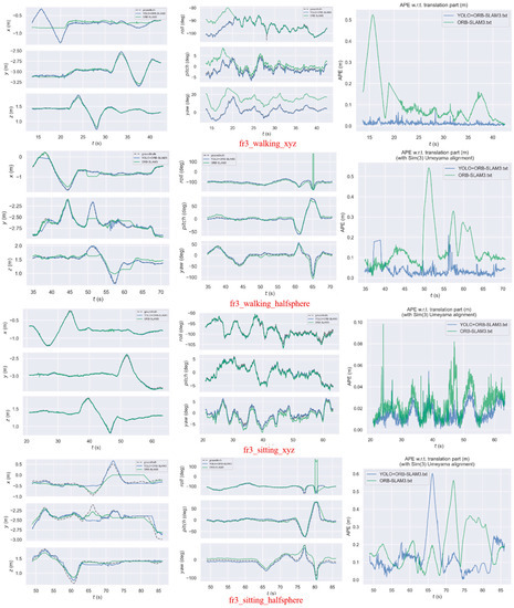 The trajectory accuracy is primarily assessed using two metrics: absolute trajectory error (APE) and relative attitude error (RPE [29]). Because the estimated camera trajectory’s initial poses and the true value of the trajectory differ slightly. The initial pose-transformation matrix must be estimated using the least squares method, and the trajectory accuracy degree is evaluated after the trajectories are aligned. Because the algorithm used in this paper is based on ORB-SLAM3, the performance of this paper is first compared to the original ORB-SLAM3 algorithm. Then, it is compared to the current high-performing semantic SLAM algorithms DS-SLAM and DynaSLAM for dynamic scenes, as well as two recent object-detection-based SLAM algorithms, DO-SLAM and [25]. The comparison results between the algorithms in this paper and ORB-SLAM3 are presented first.