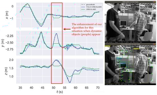 As shown in Figure 4, due to the interference of a large number of dynamic feature points, especially when dynamic objects occupy the main position of the image, the estimated trajectory of ORB-SLAM3 will have a large error with the real trajectory on the ground, and even a short tracking loss will occur because the correct feature match cannot be found. The method used in this study effectively remedies this phenomenon.