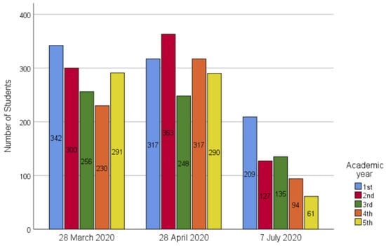The survey questionnaire was administered to all the students (n = 1916) of Bursa Uludağ University Faculty of Medicine, with the exception of Grade 6 students, on the last days of three distinct periods, 28 March, 28 April, and 7 July 2020, referred to as silent, proactive, and active periods, with n1 = 1419 (73.8%), n2 = 1535 (79.8%), and n3 = 626 (32.6%) participants, respectively. The percentage distribution of the students according to their grades, Grade 1–Grade 5 (G1–G5), was 24.2%, 22.1%, 17.8%, 17.9%, and 17.9%, respectively (Figure 1). The distribution of female to male students was 53.7% to 46.3%, respectively (Table 1).