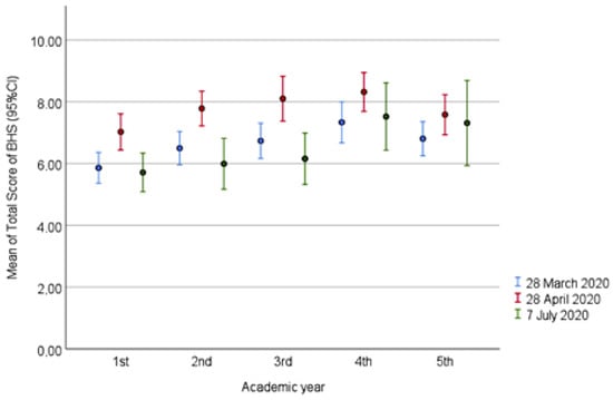 The study was conducted with a total of 3580 participants, n1 = 1419, n2 = 1535, n3 = 626, respectively, in three different periods. The participation rates of the students in the different grades were similar. However, the students’ participation in the survey applied in the three periods decreased significantly in the third evaluation period, which could be explained by the term “survey fatigue” among the students [18]. In different studies conducted during the pandemic, certain sociodemographic characteristics have been found to affect depression levels. Similar to the current study, recent reports have shown that being female, a student, and young are risk factors for depression [19,20]. The general scores of the Beck Hopelessness Scale were found to be higher in female students, which is consistent with published literature (See the Supplement File, Table S2).