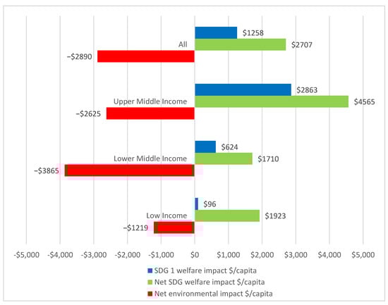 Over the period of 2000 to 2019, the net environmental impacts per capita were USD −2890 on average for all 99 economies, USD −2625 for upper-middle-income economies, USD −3865 for lower-middle-income countries, and USD −1219 for low-income countries (Figure 1). These environmental losses are more than half the overall net SDG welfare gains from progress towards the 17 SDGs for upper-middle-income economies, over 60% of the welfare gains for low-income countries, and more than two times the net SDG welfare gains for lower-middle-income economies. Averaged across all 99 EMDEs, negative net environmental impacts (USD −2890/person) match net SDG welfare gains (USD 2707/person), which suggests that if these environmental losses were eliminated, then overall net SDG welfare gains from progress towards the 17 SDGs would have doubled over 2000–2019.