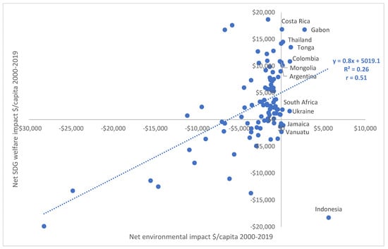 Figure 2 depicts the pairwise comparison between net environmental and SDG welfare impacts over 2000 to 2019 for the 99 EMDEs. The figure shows that net SDG welfare impacts are correlated (r = 0.51) with net environmental impacts. In our analysis, we provide the Pearson correlation coefficient, r, which reflects the extent of a linear relationship between two continuous variables and is based on the raw data. This is preferred to the Spearman correlation which evaluates the monotonic relationship based on the ranked values for each variable. Countries with lower environmental losses over this period tended to have higher SDG welfare gains. Among the 12 EMDEs with positive net environmental impacts, only Indonesia, Jamaica, and Vanuatu also have net SDG welfare losses from 2000 to 2019.
