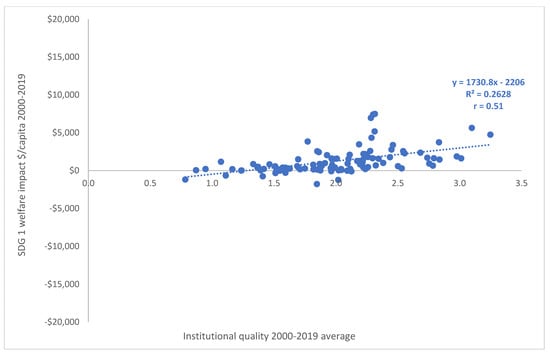 In addition, we compare the measures of SDG 1 and net welfare impacts with an indicator of institutional quality for the 99 EMDEs averaged over 2000 to 2019. We construct this indicator from the World Bank’s Worldwide Governance Indicators (WGI) [22]. There are six measures of institutional quality and governance in the WGI. The first measure includes political stability and the absence of violence and terrorism. This reflects perceptions of the likelihood of politically motivated violence, including terrorism, and political instability. The second measure focusses on the control of corruption. This reflects perceptions of the extent to which public power is used for private gain, which includes grand and petty forms of corruption, and also reflects the “capture” of the state by elites and private interests. The third measure reflects government effectiveness. This indicates perceptions of the quality of the civil service, the quality of public services, and the degree of its independence from political pressures, the quality of policy designs and implementation, and the commitment of the government to enforcing such policies. The fourth measure covers regulatory quality. This reflects perceptions of the ability of the government to formulate and implement sound policies, including policies that permit and promote private sector development. The fifth measure looks at rule of law. This captures perceptions of the extent to which individuals have confidence in and abide by the rules of society. This particularly applies to the quality of enforcement of contracts, property rights, the police, the courts, and the likelihood of violence and crime. The sixth measure covers voice and accountability. This reflects perceptions of the extent to which a country’s citizens can participate in choosing their government, in addition to having freedom of expression and association, and a free media [22].