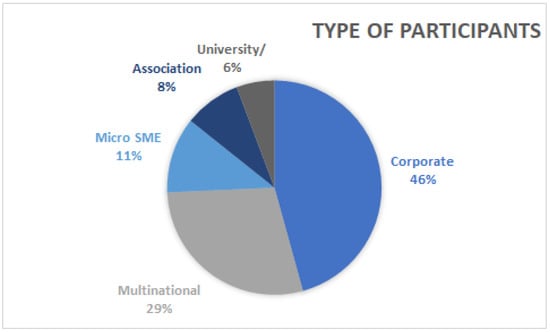 The mentioned 11% corresponds to micro-SMEs, companies with fewer than 10 employees and an annual turnover below EUR 2 million. This category in the questionnaire was identified as the category “Friends”. In Figure 1, the corporate number contains the SMEs. The definition of SMEs by the EU corresponds to businesses with fewer than 250 employees and a turnover of less than EUR 50 million. Altogether, micro-SMEs and SMEs sum 57% of the participants (without counting the representation of the industrial national associations).