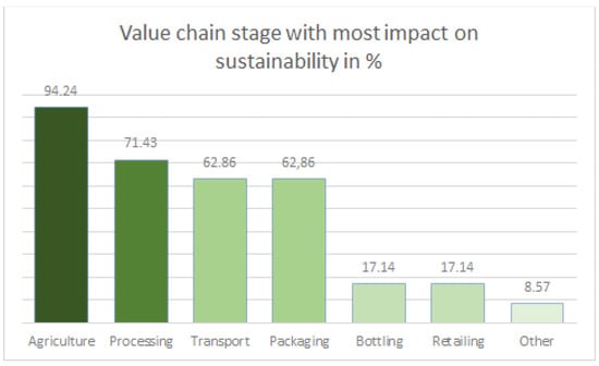 The answers regarding the value chain stages with larger impacts on sustainability and obtained from different countries are summarized in Table 4. According to the participants, the phases with the largest impact on sustainability are agriculture (95% of answers), processing (71%), transport (62%), packaging (62%) and bottling (24%). When the above results are represented in a bar chart (Figure 4), it is clearly seen that the industry estimates that agriculture is the largest contributor. This is in agreement with recent results disclosed for the carbon footprint of orange juice, where the orange crop is responsible for 60% of the total carbon footprint [53]. Three answers were gathered under the stage “other”. One of the responses referred to the transport in vessels, which is of special importance in transporting the orange juices from Brazil. In fact, transportation-related GHG emissions associated with fresh produce in general can increase by a factor larger than two of the cradle-to-market carbon footprint [54]. Vessels dedicated to transporting fruit juices and related products from the producers (usually Brazil) to consumer markets in Europe and America include climate-controlled chamber tanks, which further increase their energy consumption [54]. The second comment highlighted the sourcing of raw materials as a key parameter, suggesting the processing of unsold fruit at the retailers in Germany, as an example. Finally, the interviewed producers also pointed out the impact of the policies in force in each country.