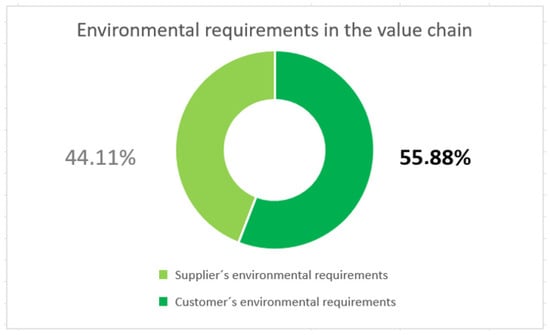 As for the block of questions regarding the demands coming upstream or downstream in the value chain, results indicate that there is an increasing pressure coming from the customer’s side (Figure 6). In fact, 55.88% of the surveyed companies declared receiving environmental requirements from their customers, while only 44.11% of the answers indicated such a requirement from the suppliers’ side. This confirms that the request to improve environmental aspects principally originates from customers, and it is translated upstream.